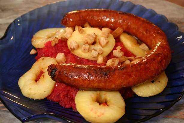 A kockára vágott burgonyát fél puhára előfőzzük. Hozzátesszük a finomra vágott hagymát, a céklát, a felkockázott almát, az egészet együtt főzzük. Eközben kisütjük a kolbászt. Kisütjük a kis kockára vágott szalonnát is, ezt félretesszük. A szalonna zsírjában sütünk ki néhány alma karikát, ezzel fogjuk díszíteni az ételünket. Mindeközben a céklás burgonyánk kifőtt, összetörjük. Tányérra szedjük a burgonyát, ráhelyezzük a sült kolbászt, erre a sült almakarikákat, s rászórunk sült szalonna kockákat.