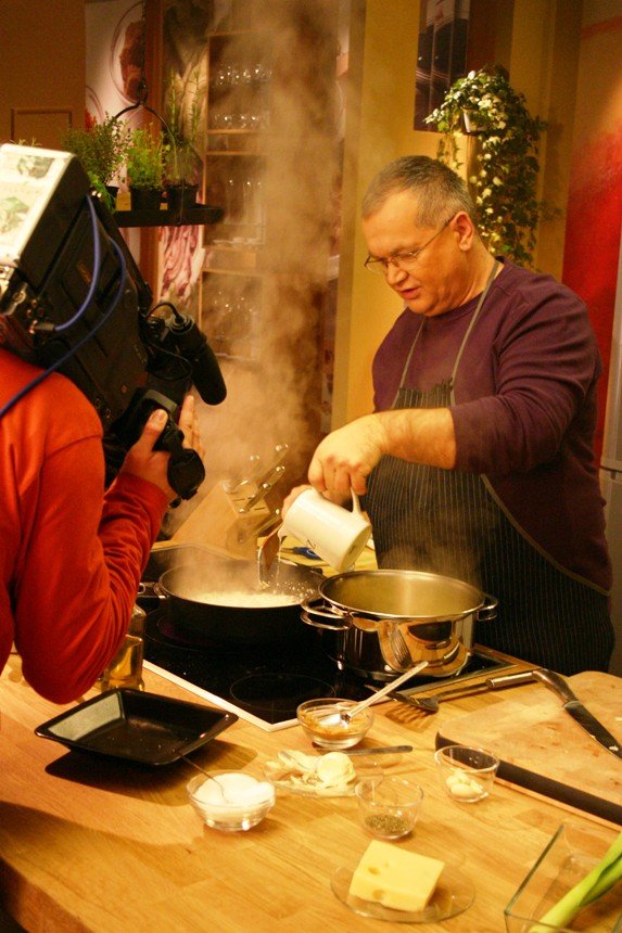Működik a “boszorkánykonyha” mindenképpen érdemes a tészták főzése alatt elkészíteni a mártást, mert amikor leszűrjük még fog keményen al dente akkor a forró szaftból szívja fel a nedvességet, és még finomabb lesz. Az asztalon látszanak a hozzávalók: Ravioli vargányával töltve, olíva olaj, vaj, póréhagyma, levespor, tejszín, bors, ementáli sajt, bazsalikom ha lehet friss. Na meg persze só!