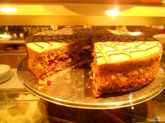Igen, nem tévedés a feketeerdei német cukrász maga ízlésére komponálta az eszterházy tortánkat, és snapszba áztatott fekete cseresznyével, és ehhez illő krémmel töltötte meg. Mit ne mondjak nagyon finomra sikeredett. Ráadásul mint erre felé szokásos gigantikus szeletben szervíroznak. Szombat délután nem is találtunk üres férőhelyet.